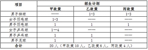 本年度招生项目为男子排球、男子羽毛球、女子羽毛球、男子乒乓球、女子乒乓球和男子足球,最终根据考生测试实际水平和运动队发展需要协调各项目招生计划、确定签约人数。